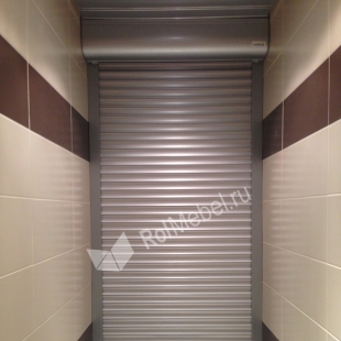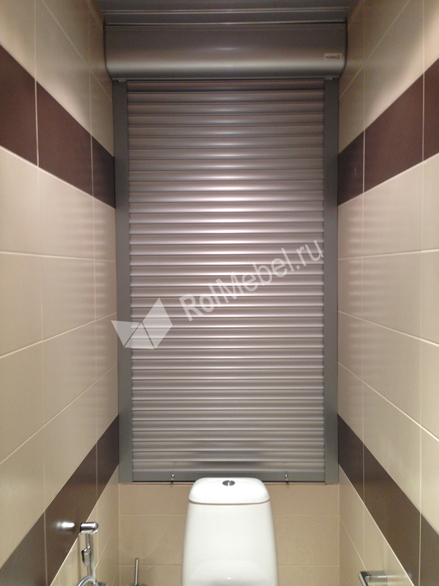 Рольставни в туалете серебристого цвета, установлены коробом наружу. Короб круглый, материал алюминий, полотно пенонаполненное.